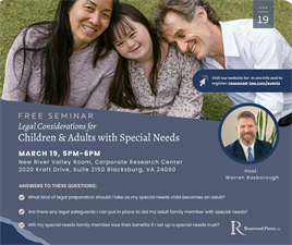 Join us for a FREE Seminar on issues that impact individuals with special needs and their caregivers. TOMORROW, Thursday March 19 at 5pm Warren Rosborough will outline different legal strategies that help provide care and financial security for individuals with special needs and allow their caregivers to give them the best life possible.